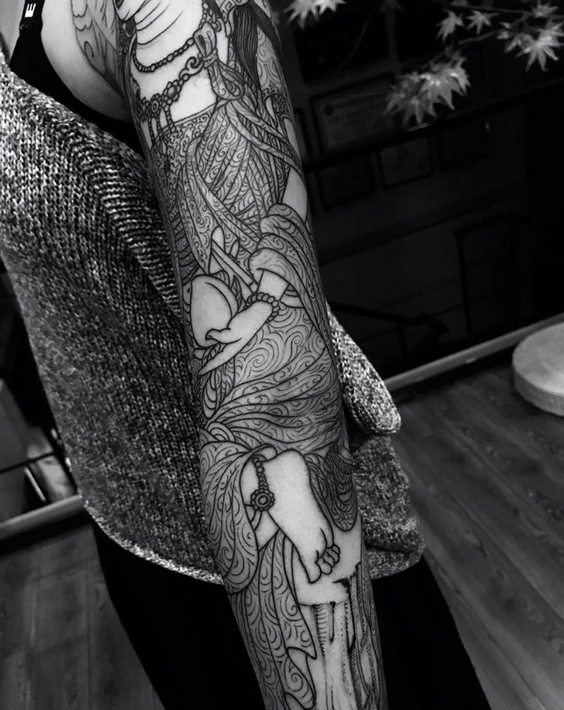 当前位置: 首页 >浙江省杭州市纹身店-异绣堂纹身工作室纹身图案>水月观音纹身图片_花臂观音佛教题材纹身图案