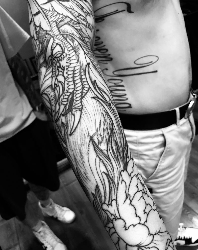 当前位置: 首页 >浙江省杭州市纹身店-异绣堂纹身工作室纹身图案>凤凰传奇纹身图片_手臂胸部新传统凤凰花臂纹身图案