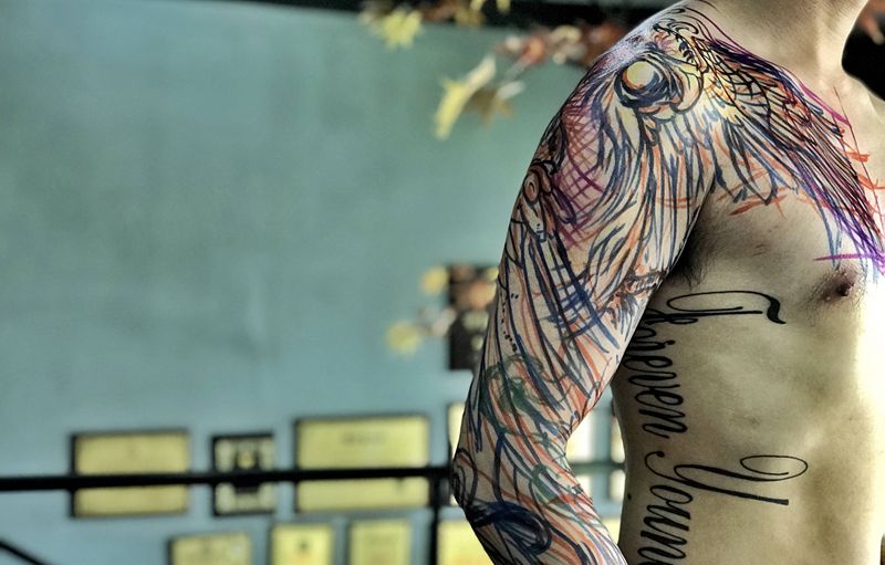 当前位置: 首页 >浙江省杭州市纹身店-异绣堂纹身工作室纹身图案>凤凰传奇纹身图片_手臂胸部新传统凤凰花臂纹身图案