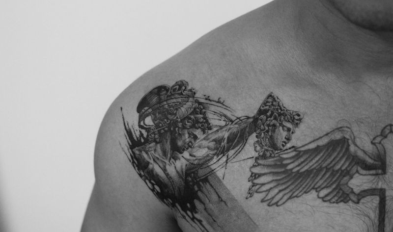 帕修斯&赫拉克勒斯纹身图片_肩部欧美写实写实希腊神话力量纹身图案
