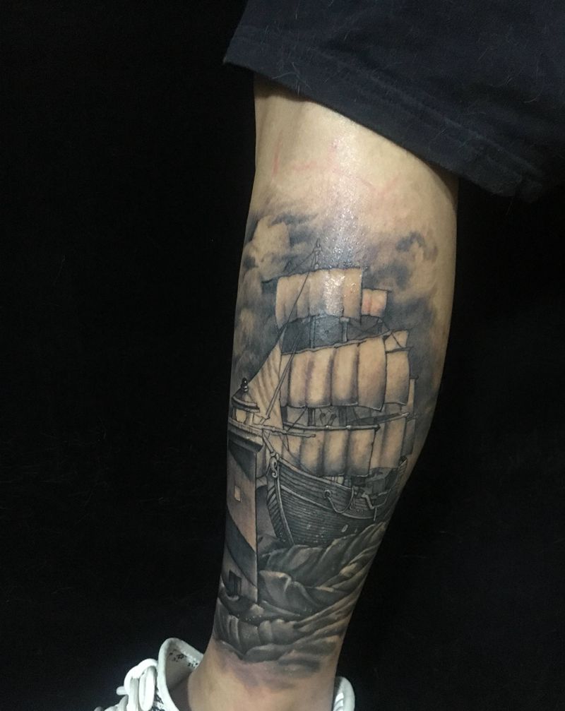 灯塔和帆船纹身图片_腿部欧美写实纹身图案