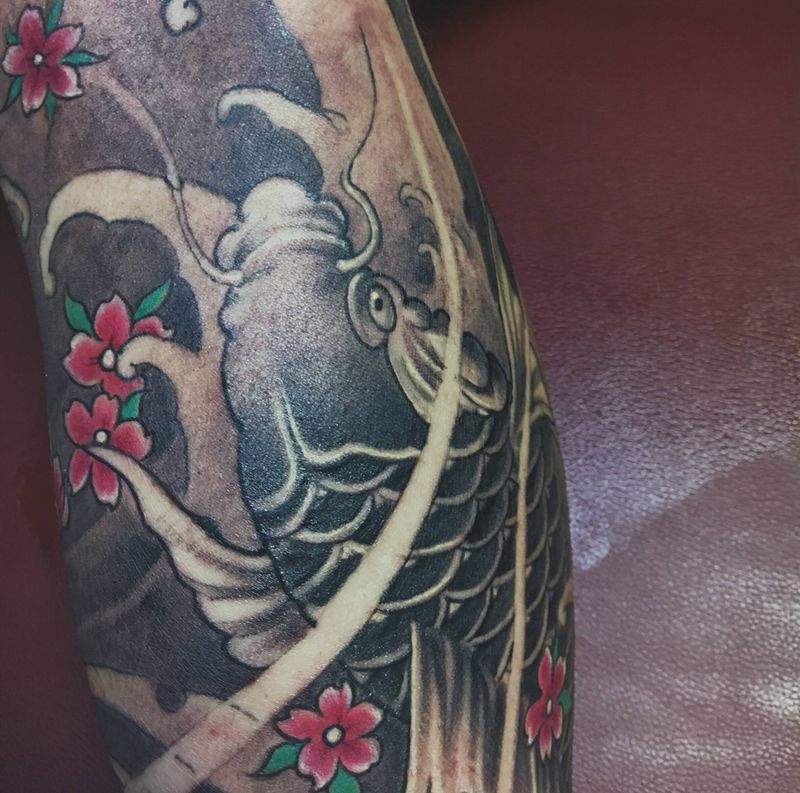 莲花和鱼纹身图片_腿部新传统纹身图案