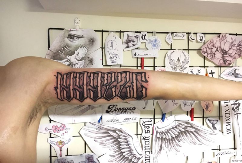 当前位置: 首页 >浙江省杭州市纹身店-无为纹身纹身图案>花体纹身图片_手臂花体字纹身图案