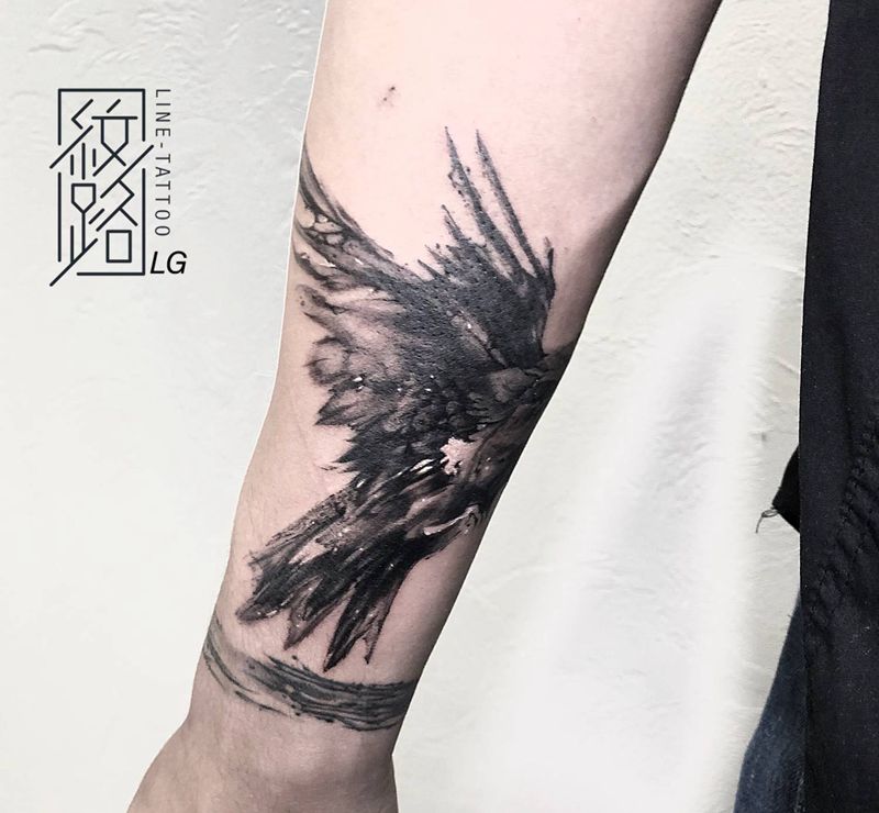 当前位置: 首页 >浙江省杭州市纹身店-纹路刺青纹身图案>乌鸦纹身图片_手臂水墨欧美写实暗黑乌鸦纹身图案