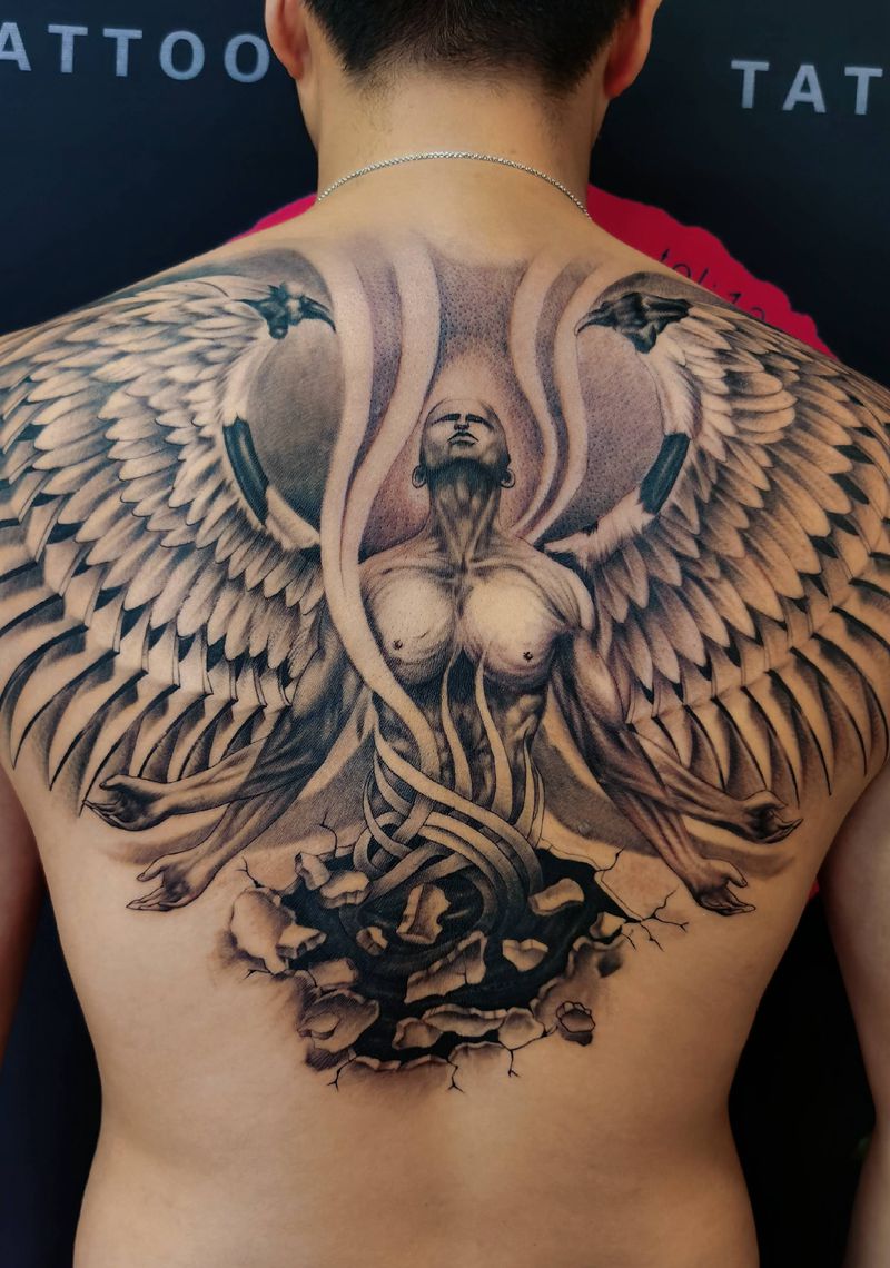 当前位置: 首页 >浙江省杭州市纹身店-纹人天下刺青会所纹身图案>救赎纹身图片_背部手部欧美写实翅膀天使恶魔纹身图案