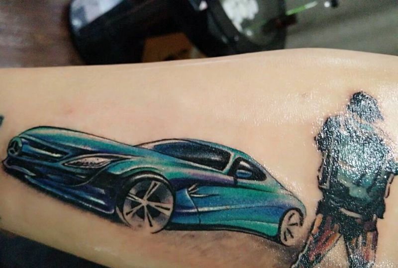 当前位置: 首页 >浙江省宁波市纹身店-名品轩刺青纹身图案>彩色小车纹身图片_手臂欧美人物原创成品纹身图案