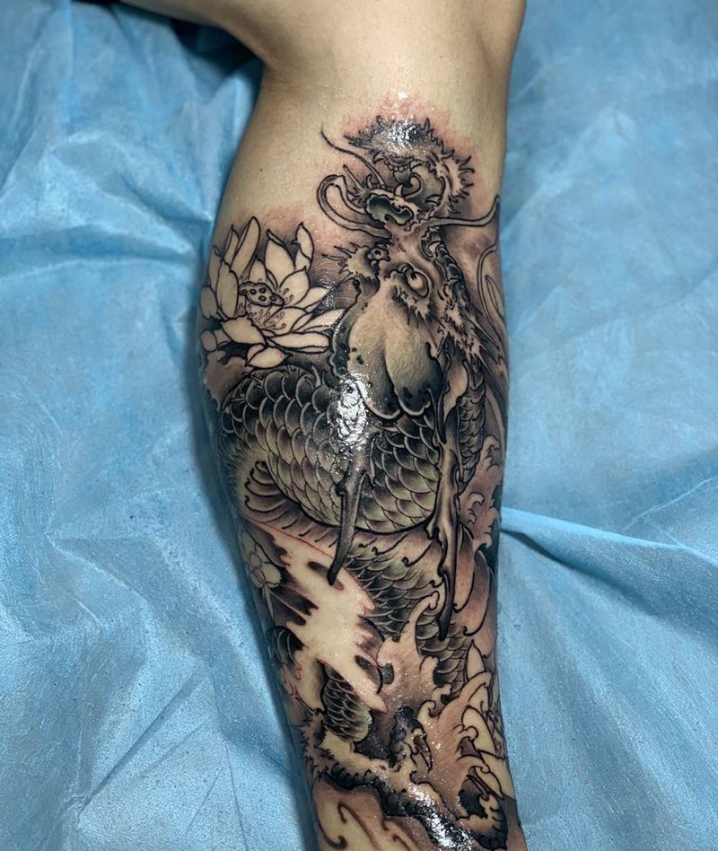 • T网红王老大花腿龙纹身图片_腿部新传统纹身图案