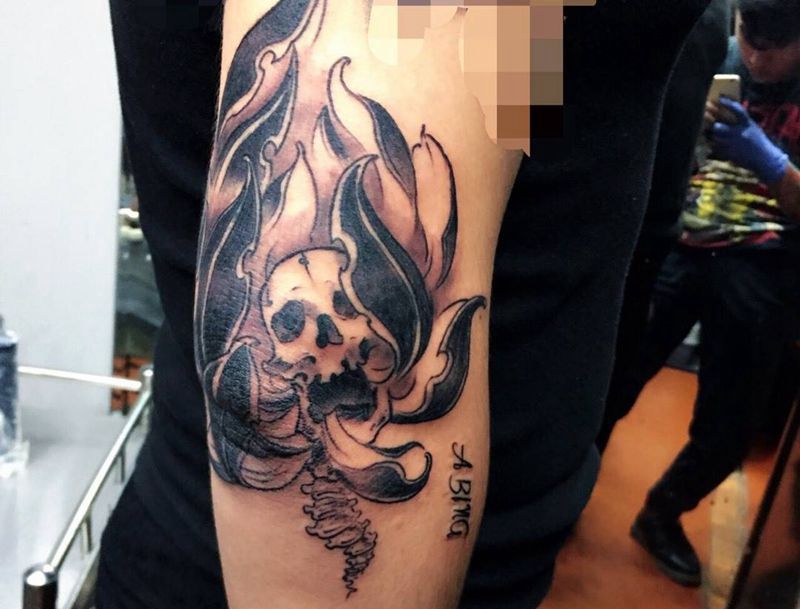 当前位置: 首页 >浙江省宁波市纹身店-无风格纹身工作室纹身图案>骷髅莲花纹身图片_成品手臂传统几何鬼神纹身图案