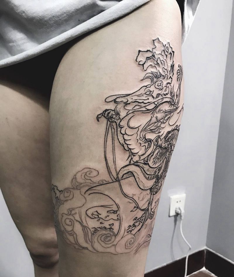 • T网红王老大花腿龙纹身图片_腿部新传统纹身图案