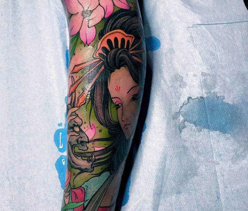 冰刺青作品纹身图片_成品腿部传统人物纹身图案