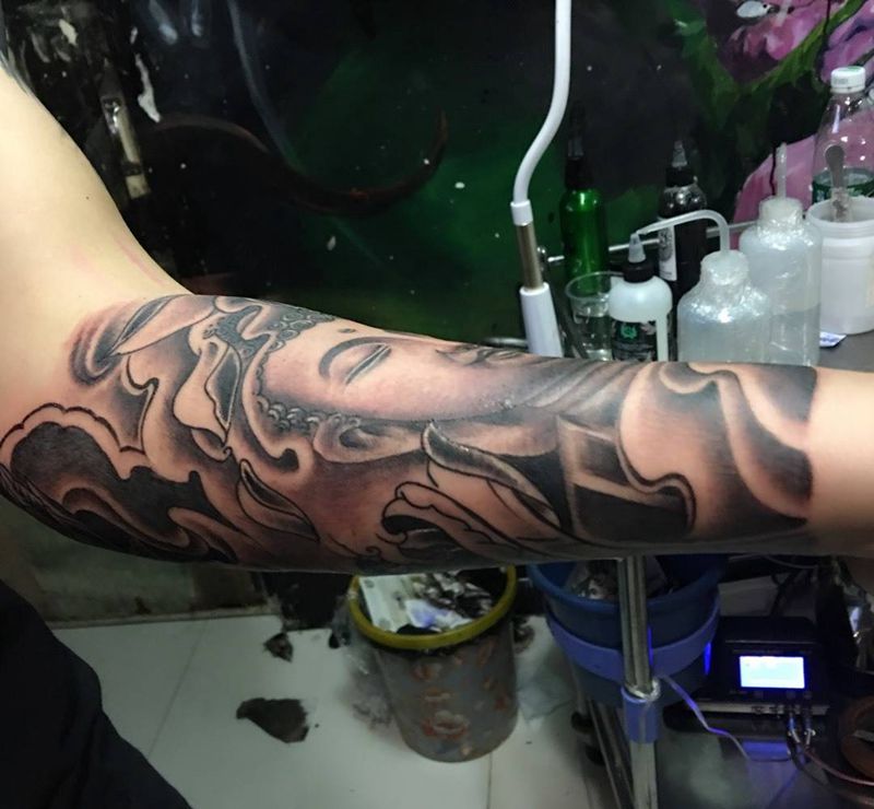 当前位置: 首页 >浙江省温州市纹身店-道格刺青纹身图案>佛头,牡丹包小臂。纹身图片