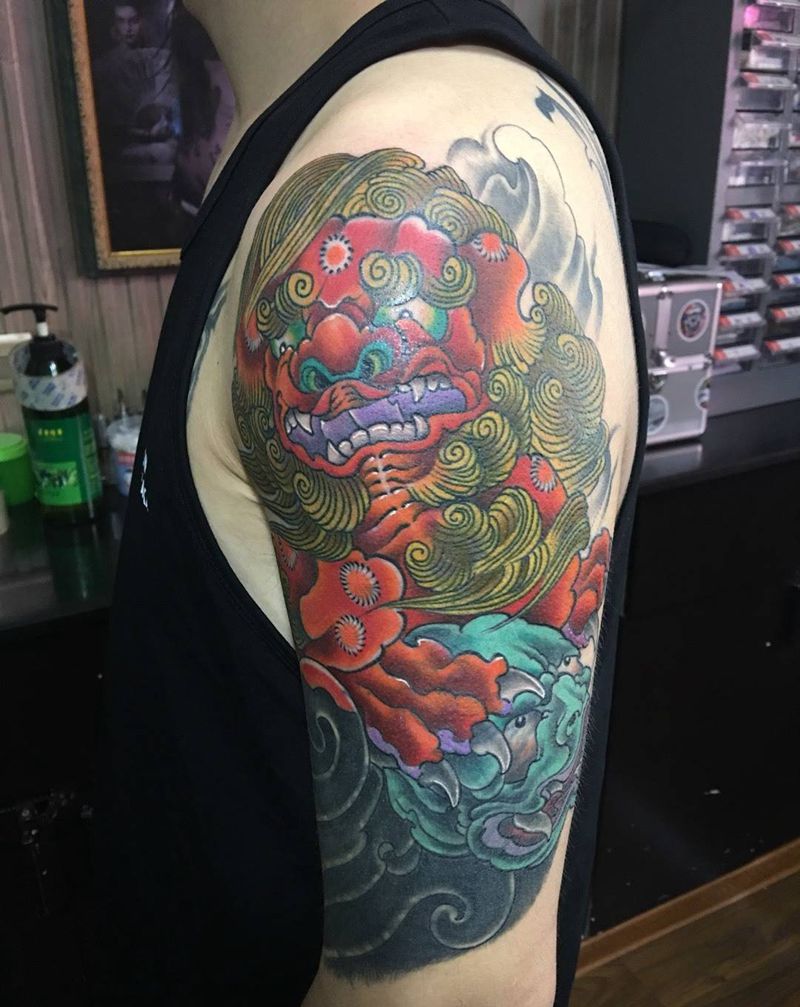 当前位置: 首页 >浙江省温州市纹身店-道格刺青纹身图案>唐狮遮盖纹身图片