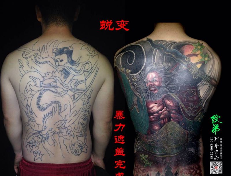 蜕变的过程!纹身图片_成品背部传统人物遮盖修改纹身图案