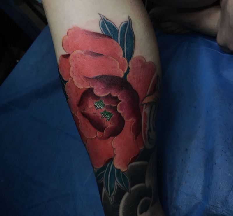 当前位置: 首页 >浙江省嘉兴市纹身店-极致刺青纹身图案>传统牡丹纹身图片_腿部新传统花,纹身图案