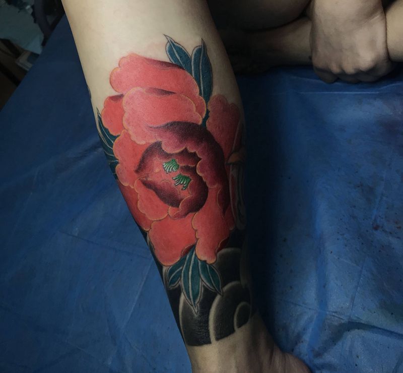 当前位置: 首页 >浙江省嘉兴市纹身店-极致刺青纹身图案>传统牡丹纹身图片_腿部新传统花,纹身图案