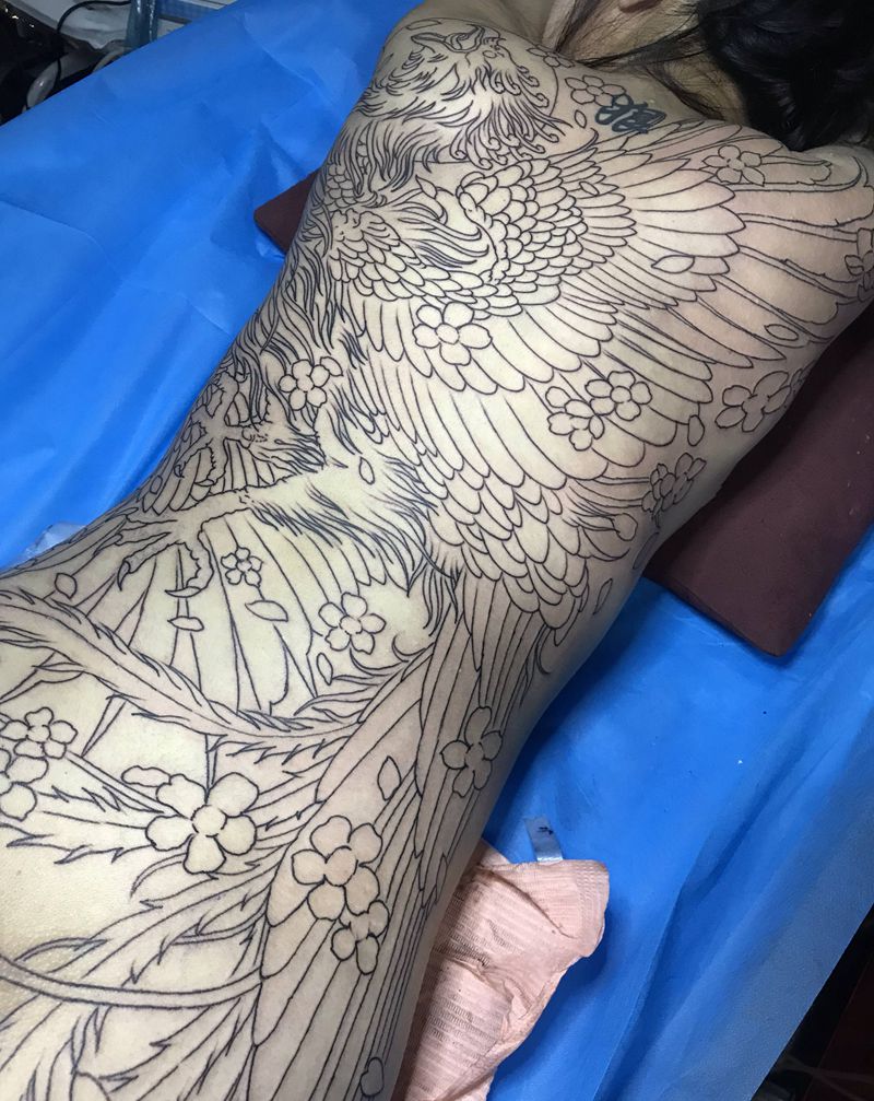 女子大满背凤凰纹身图片_背部臀部新传统纹身图案