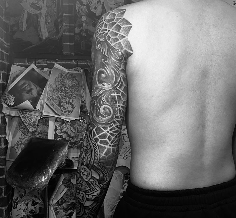 当前位置: 首页 >浙江省嘉兴市纹身店-极致刺青纹身图案>花臂纹身图片_手臂图腾点刺纹身图案