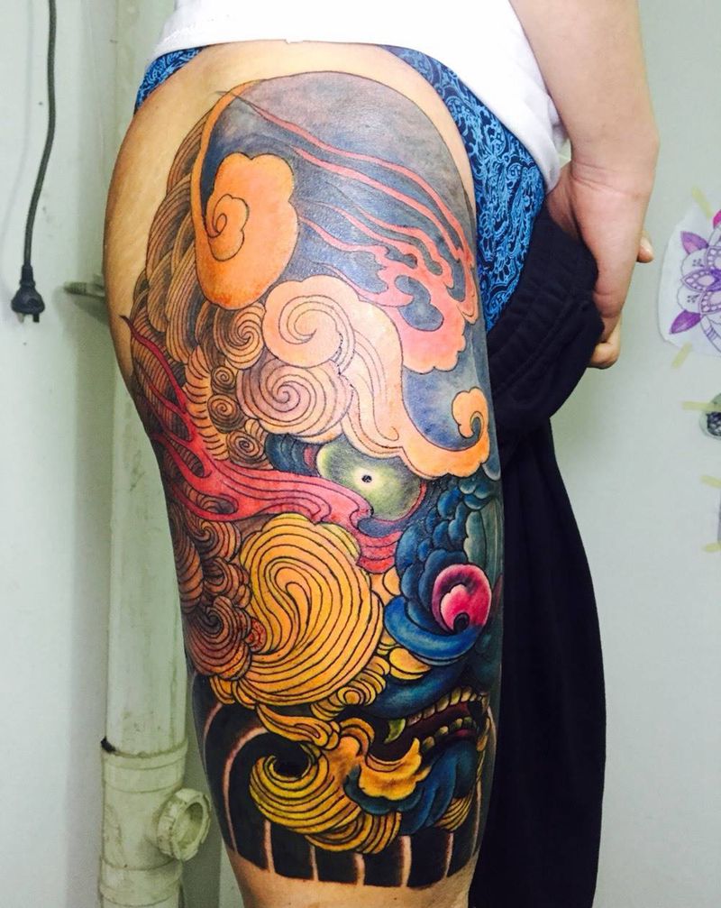 当前位置: 首页 >浙江省嘉兴市纹身店-极致刺青纹身图案>唐狮莲花~纹身图片