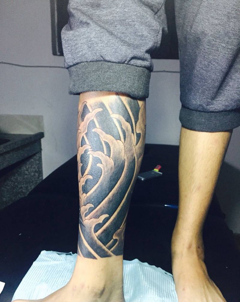 当前位置: 首页 >浙江省嘉兴市纹身店-极致刺青纹身图案>包小腿,般若和浪花~纹身图片