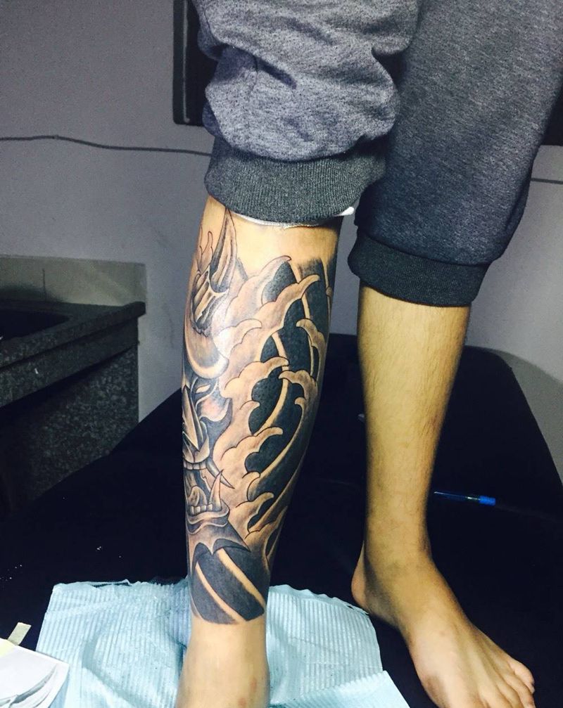 当前位置: 首页 >浙江省嘉兴市纹身店-极致刺青纹身图案>包小腿,般若和浪花~纹身图片