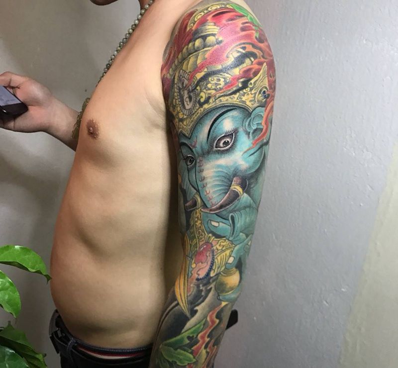 当前位置: 首页 >浙江省嘉兴市纹身店-极致刺青纹身图案>7分臂,象神纹身图片