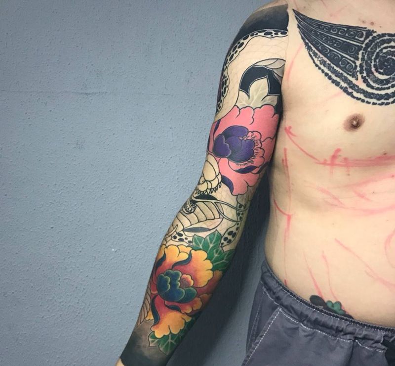 牡丹蛇,花臂纹身图片