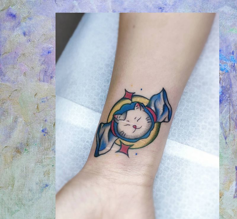 当前位置: 首页 >浙江省金华市纹身店-浦江888纹身俱乐部纹身图案>糖果小猫咪纹身图片_手臂Old School猫彩色小图纹身图案