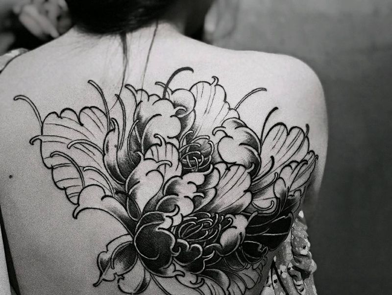 背部黑白牡丹纹身图片_背部New School素花牡丹纹身图案