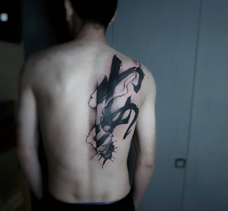 当前位置: 首页 >浙江省台州市纹身店-自述刺青OwnStory纹身图案>遮盖作品—泼墨书法【安】纹身图片_背部水墨书法纹身图案