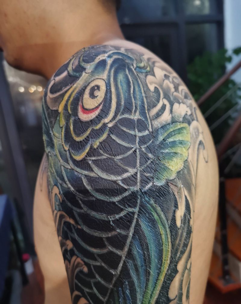 当前位置: 首页 >浙江省舟山市纹身店-墨域纹身工作室纹身图案>大臂传统鲤鱼纹身图片_新传统纹身图案