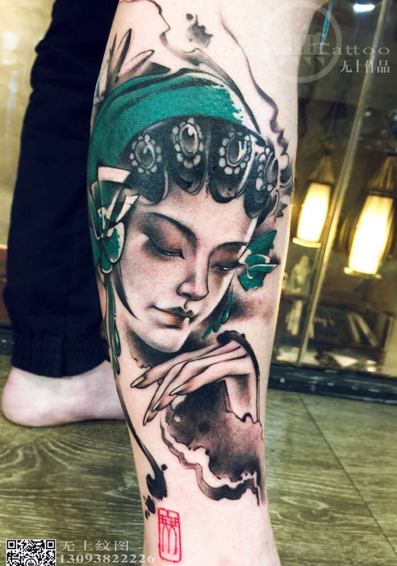 当前位置: 首页 >浙江省台州市纹身店-无上纹图纹身图案>花旦纹身图片_原创人物肖像国画成品腿部纹身图案