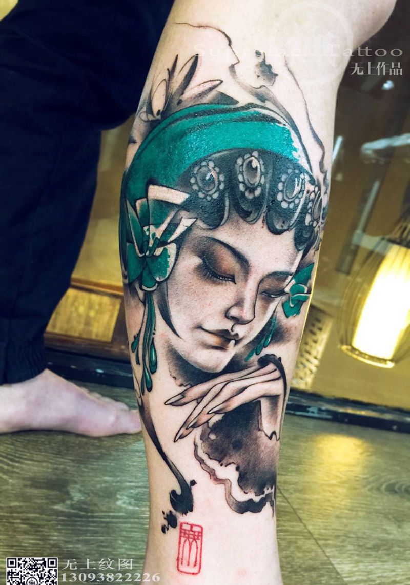 当前位置: 首页 >浙江省台州市纹身店-无上纹图纹身图案>花旦纹身图片_原创人物肖像国画成品腿部纹身图案