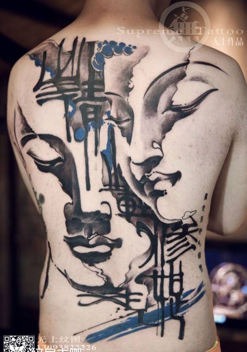 無上印象风《山清尘轻水参如是观》纹身图片_成品背部传统国画肖像宗教原创纹身图案
