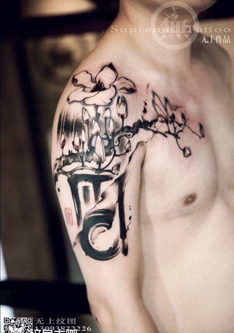 含纹身图片_成品肩部传统字符植物原创纹身图案