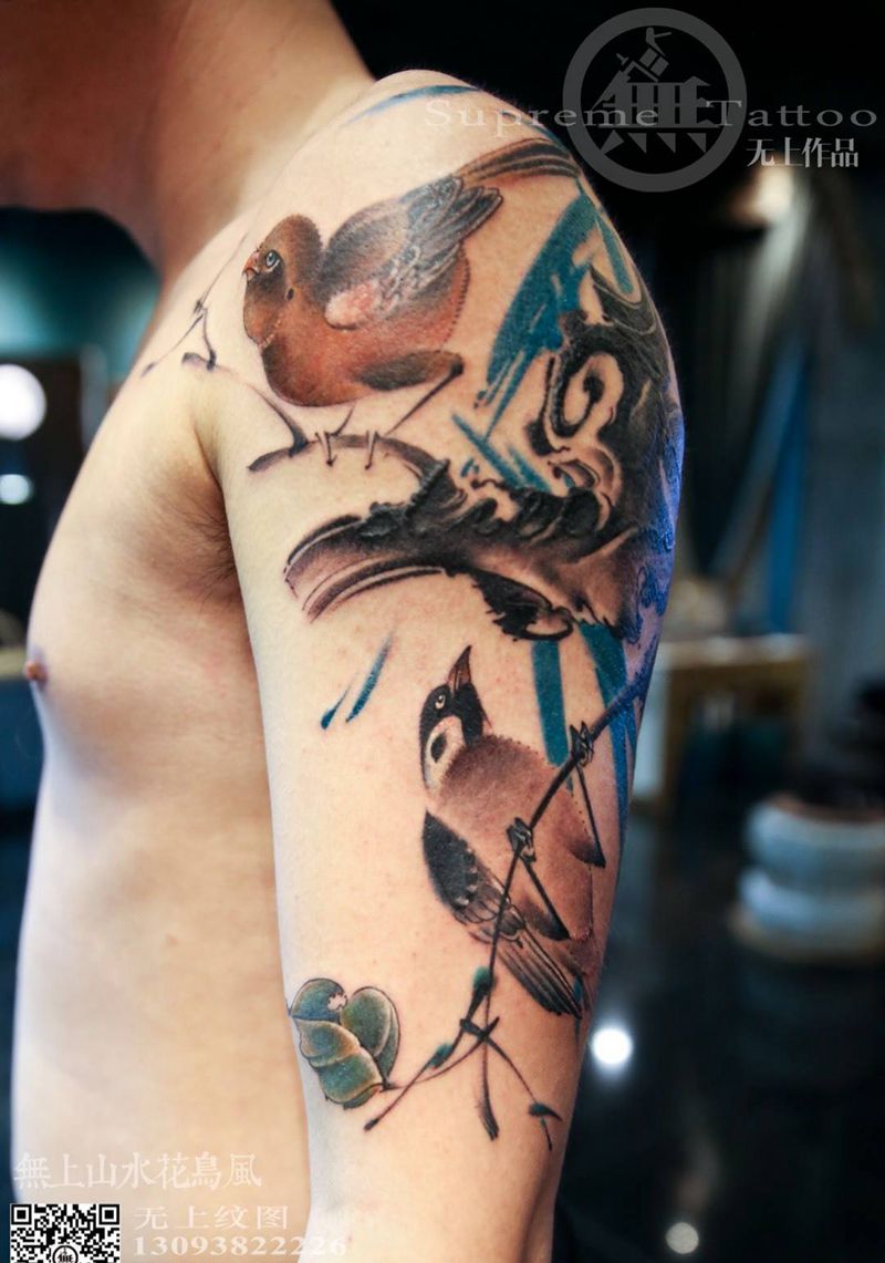 当前位置: 首页 >浙江省台州市纹身店-无上纹图纹身图案>遮盖作品纹身图片_成品手臂传统清新国画静物原创动物植物纹身图案