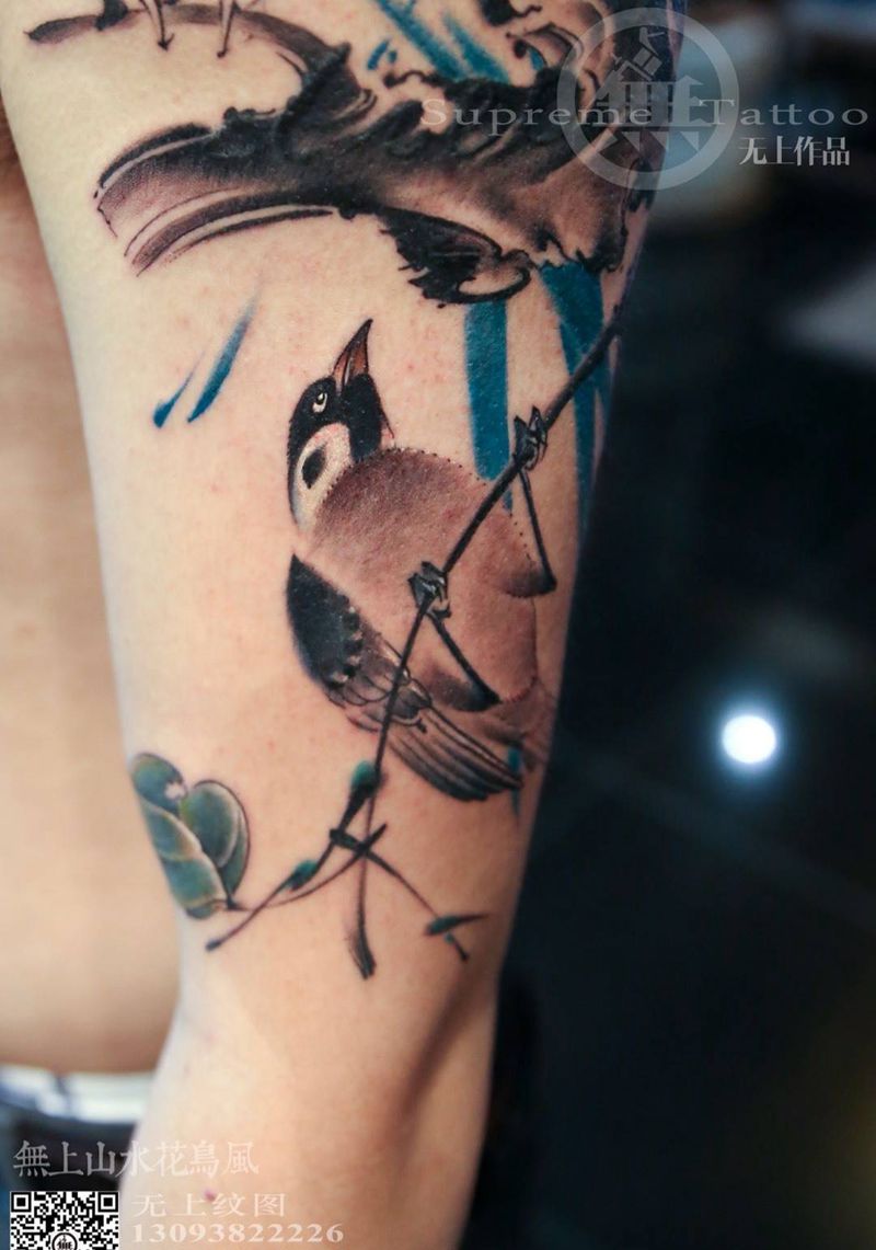 当前位置: 首页 >浙江省台州市纹身店-无上纹图纹身图案>遮盖作品纹身图片_成品手臂传统清新国画静物原创动物植物纹身图案