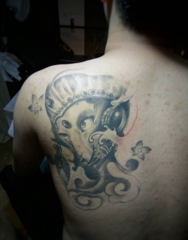 当前位置: 首页 >浙江省台州市纹身店-无上纹图纹身图案>驻店师傅修改添加象神作品纹身图片_成品肩部欧美肖像清新动物原创纹身图案