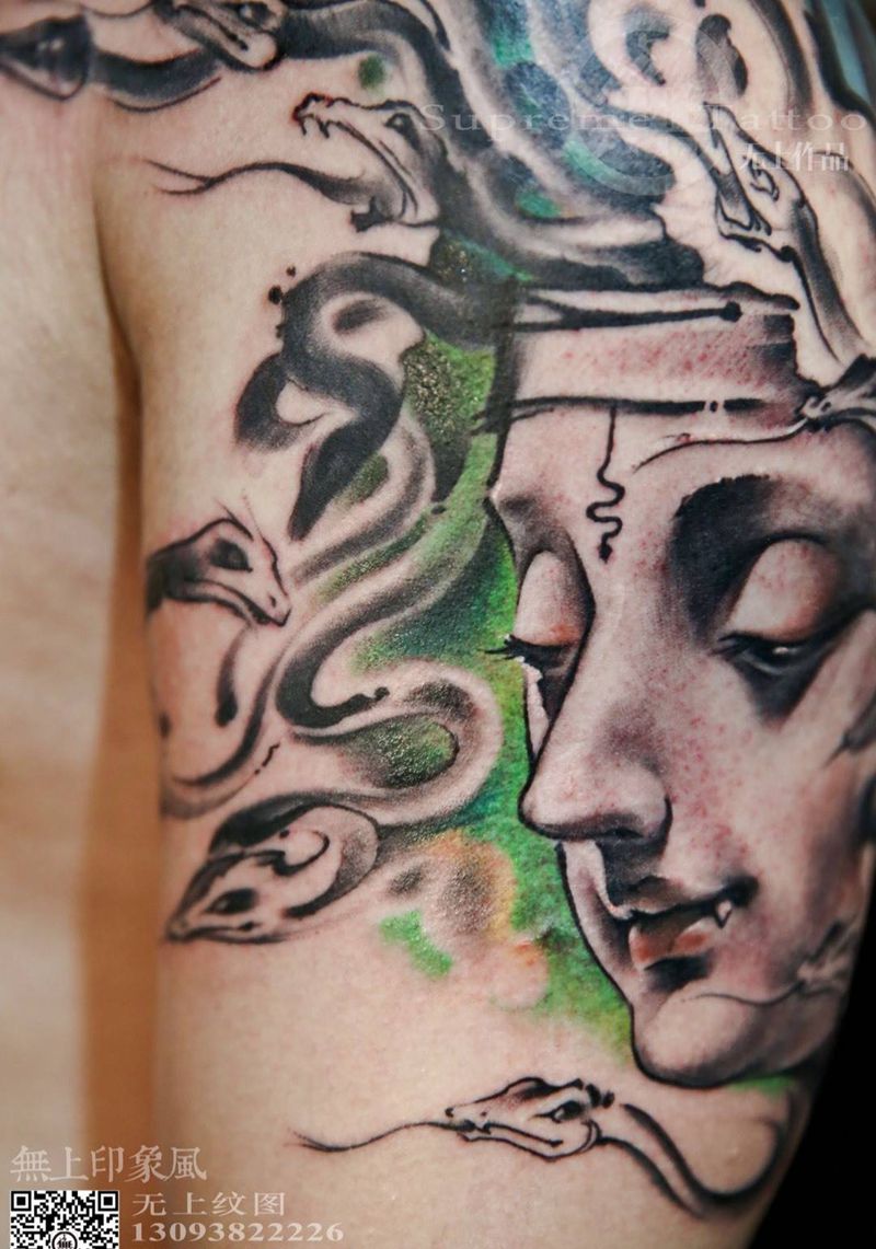 无上笔下的美杜莎纹身图片_成品手臂欧美肖像清新人物鬼神原创宗教纹身图案