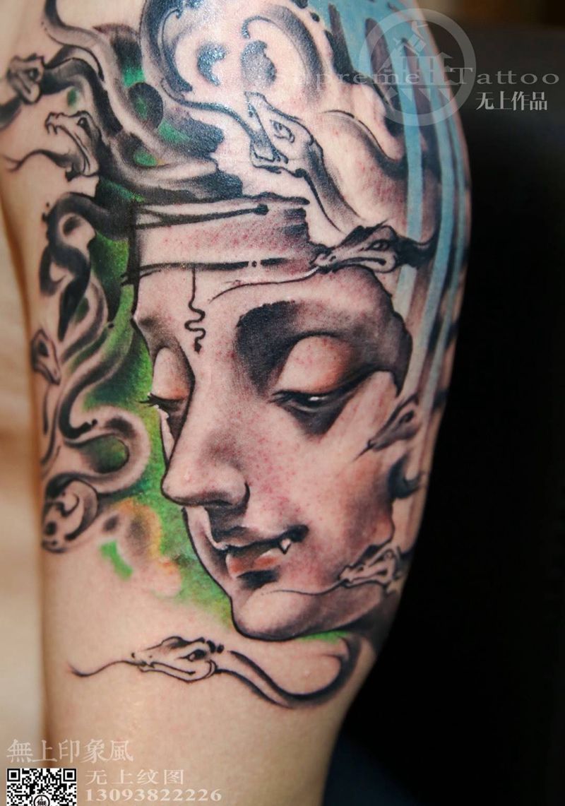 无上笔下的美杜莎纹身图片_成品手臂欧美肖像清新人物鬼神原创宗教纹身图案