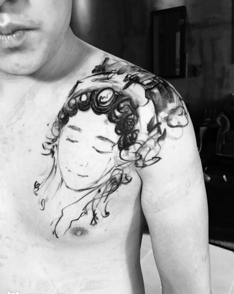 当前位置: 首页 >浙江省台州市纹身店-无上纹图纹身图案>心尖儿上的花旦纹身图片_成品胸部传统肖像清新人物原创纹身图案