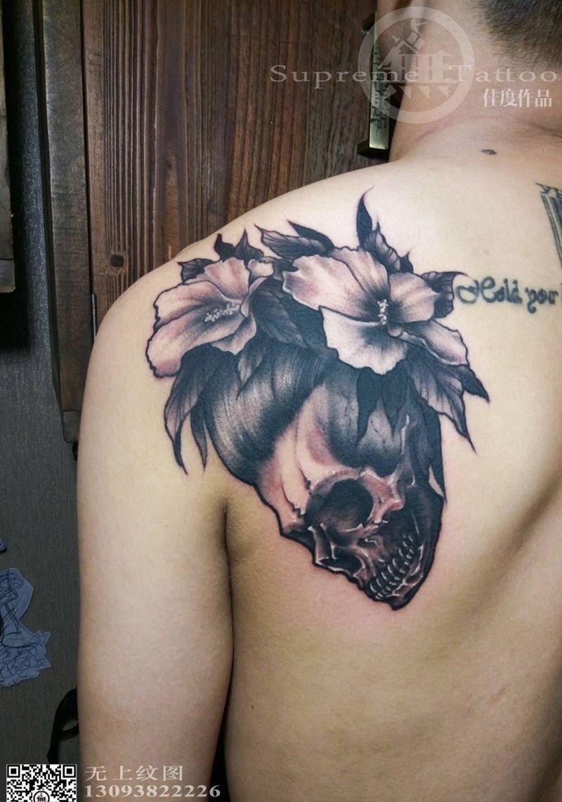 当前位置: 首页 >浙江省台州市纹身店-无上纹图纹身图案>美女骷髅纹身图片_成品肩部欧美传统肖像鬼神图腾人物静物纹身图案