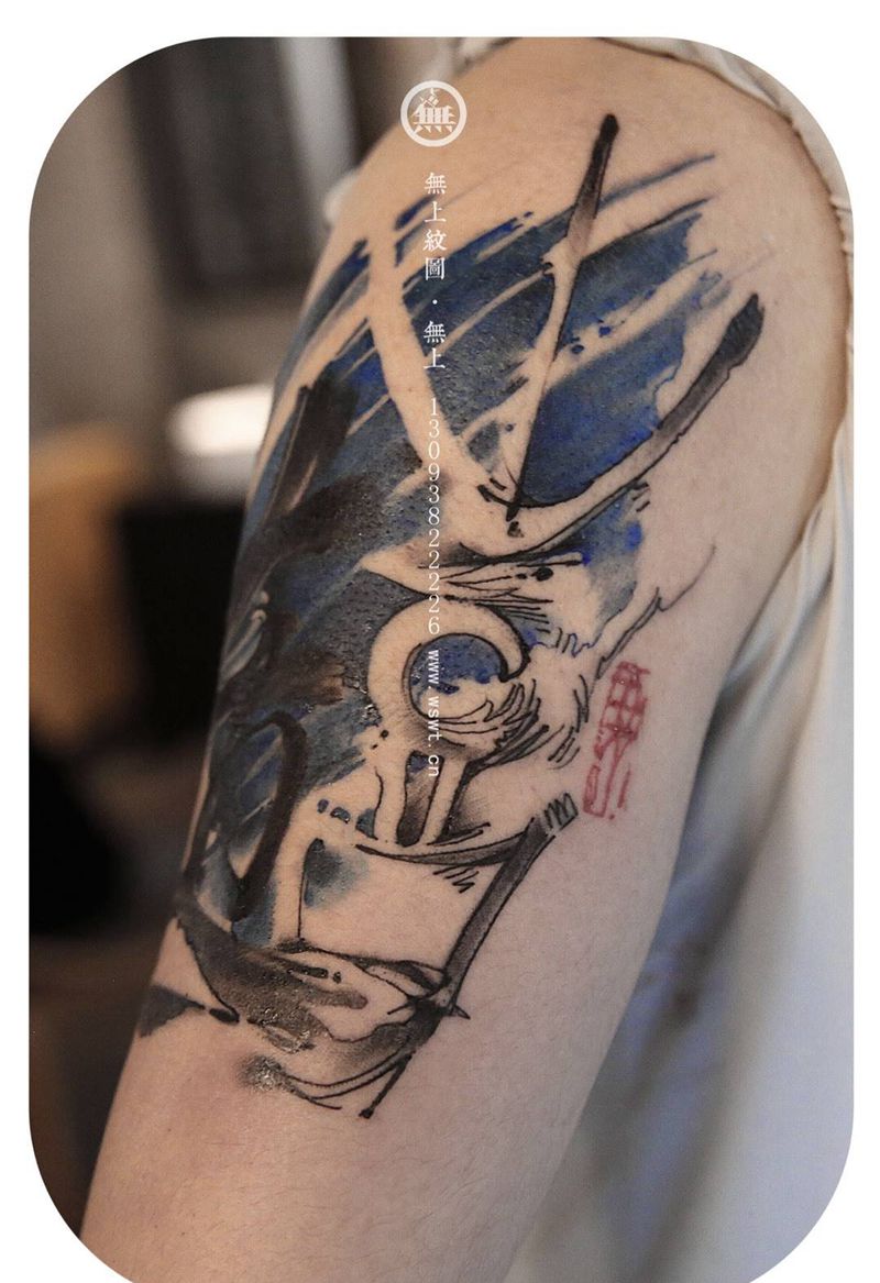 泼墨花臂纹身图片_成品手臂传统原创字符水墨书法纹身图案
