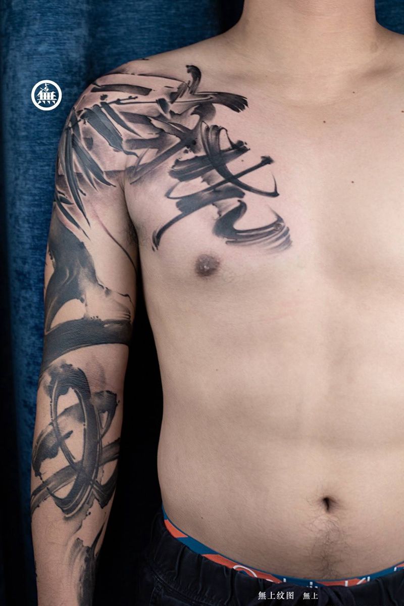 添加作品 书法花臂 无上出品纹身图片_成品肩部胸部无上纹图纹身图案
