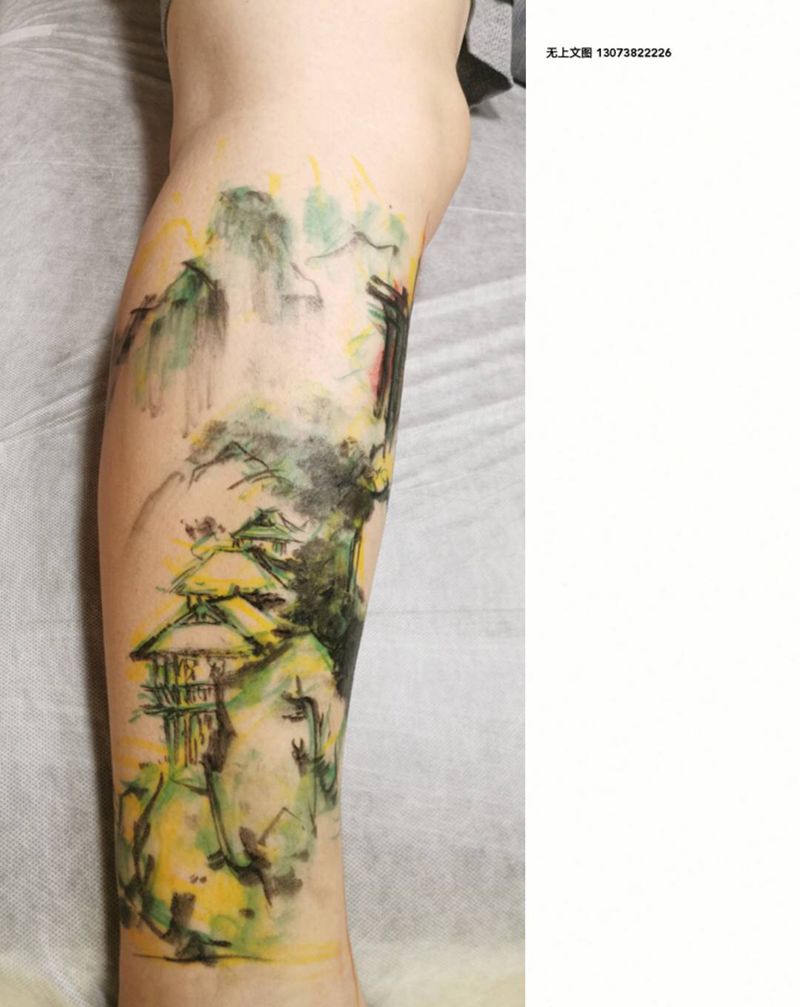 夜色山水纹身图片_腿部水墨纹身图案