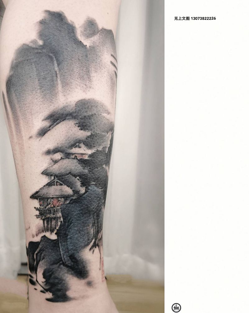 夜色山水纹身图片_腿部水墨纹身图案
