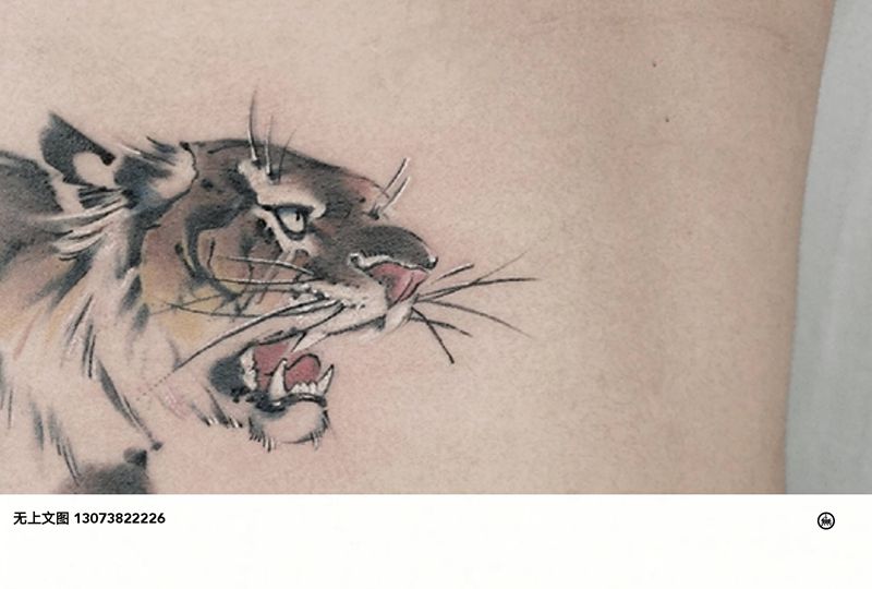当前位置: 首页 >浙江省台州市纹身店-无上纹图纹身图案>侧腰老虎 王者为谋纹身图片_腰部水墨纹身图案