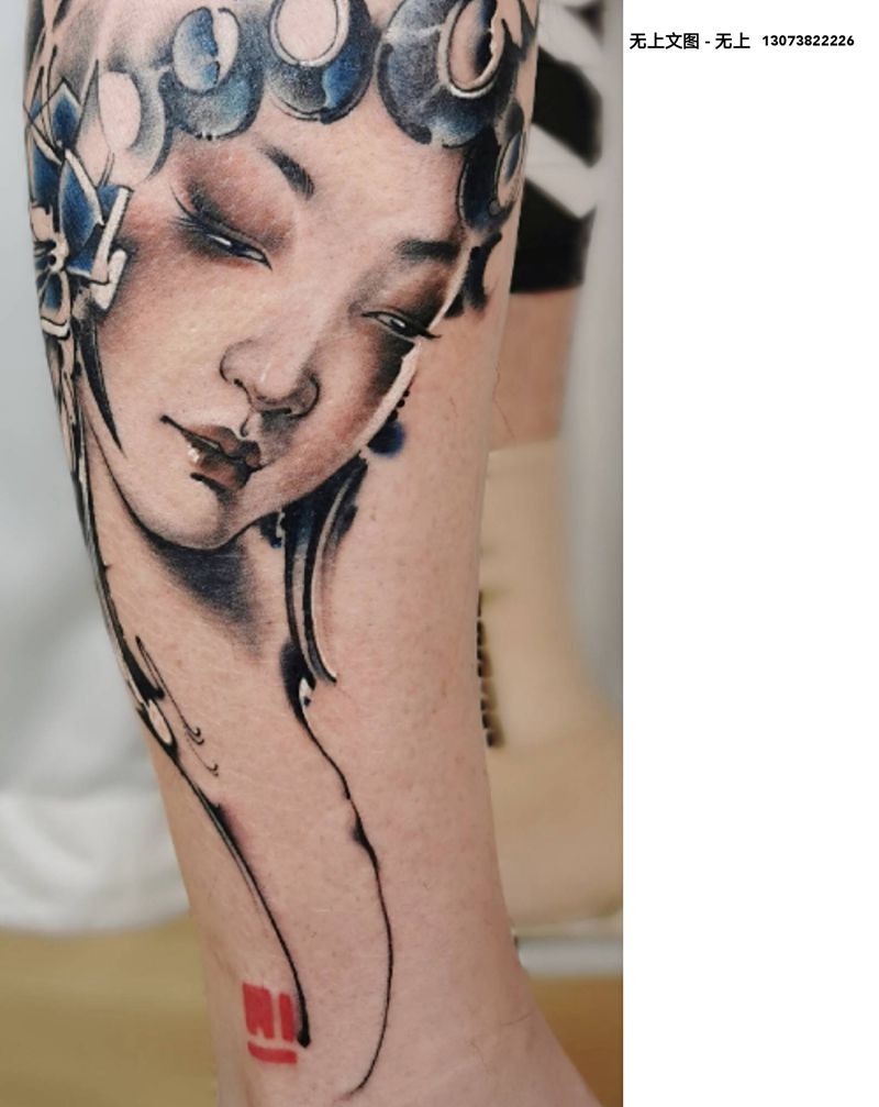 当前位置: 首页 >浙江省台州市纹身店-无上纹图纹身图案>新中式水墨人物刺青 花旦纹身图片_腿部水墨纹身图案