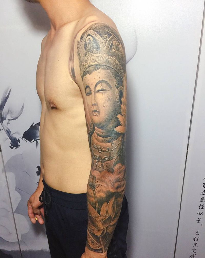 当前位置: 首页 >浙江省金华市纹身店-行者纹身纹身图案>中国风花臂纹身图片_成品手臂传统写实人物鬼神宗教纹身图案