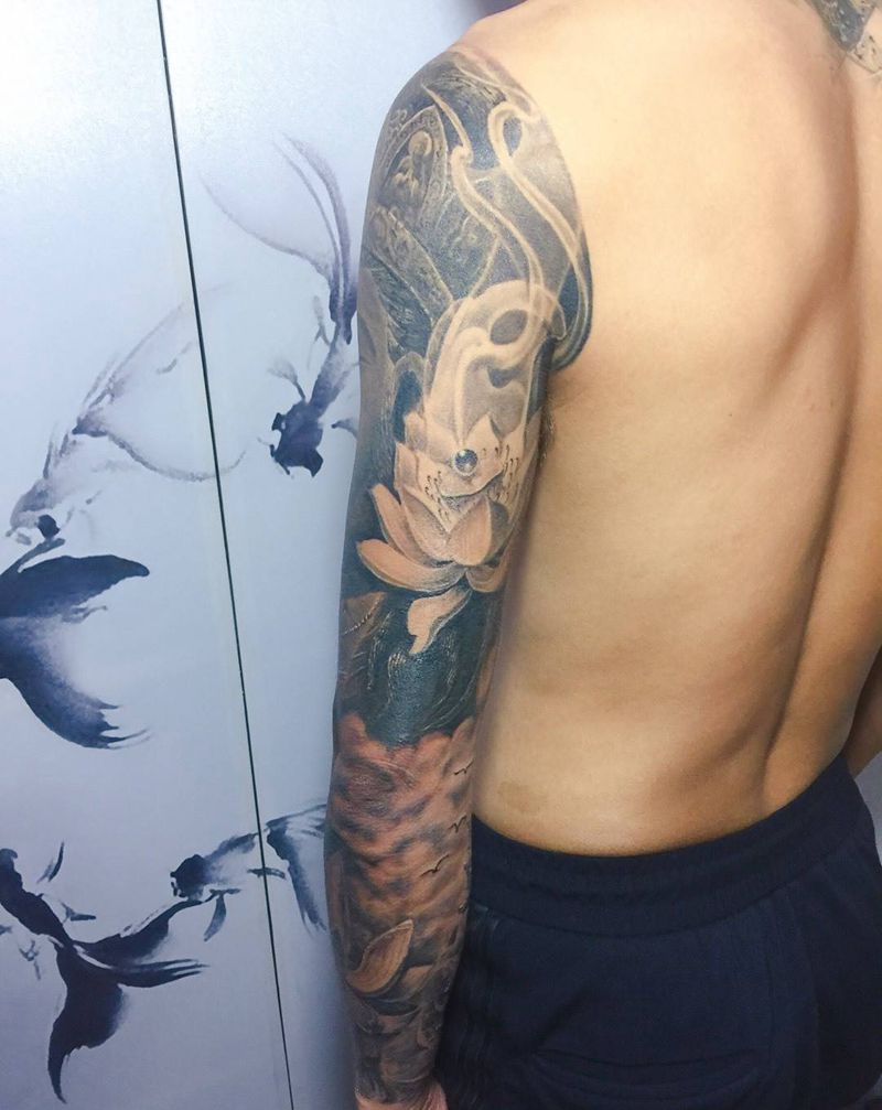 当前位置: 首页 >浙江省金华市纹身店-行者纹身纹身图案>中国风花臂纹身图片_成品手臂传统写实人物鬼神宗教纹身图案