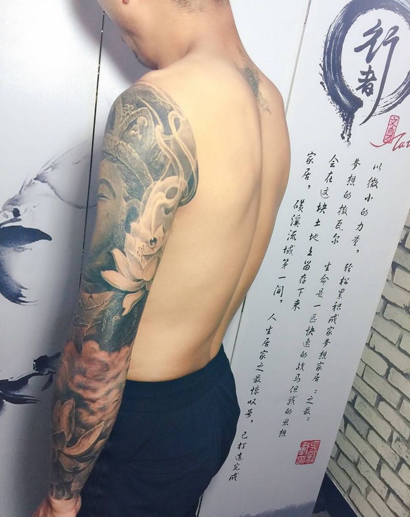 当前位置: 首页 >浙江省金华市纹身店-行者纹身纹身图案>中国风花臂纹身图片_成品手臂传统写实人物鬼神宗教纹身图案